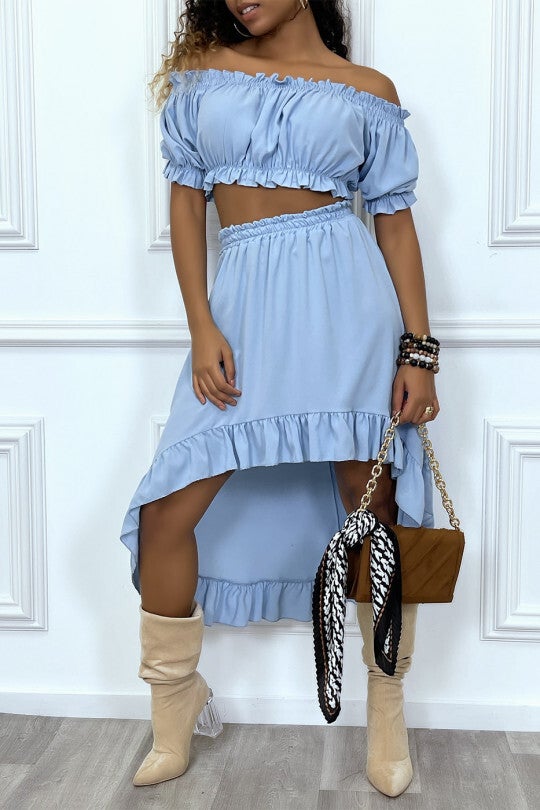 Soepelvallende set in blauw met asymmetrische rok en bardottop