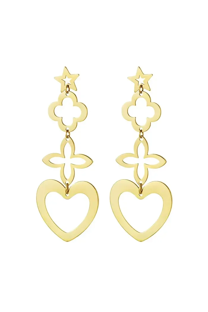 Hoe leuk zijn deze gouden statement oorbellen met vier prachtige bedels in de vorm van een hart, bloem, ster en klaver. Dankzij deze prachtige oorbellen kun jij een perfecte look creëren. Je kunt deze oorbellen bijvoorbeeld perfect dragen naar een festival of een tof feestje. Leuk om deze oorbellen te combineren met meerdere sieraden met bedels. Statement oorbellen bedeltjes zijn gemaakt van Stainless Steel en hebben een afmeting van 7,5 cm.