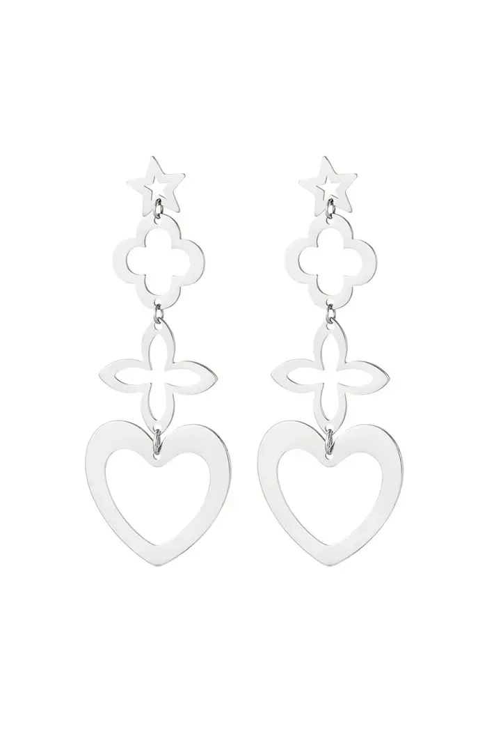 Hoe leuk zijn deze zilveren statement oorbellen met vier prachtige bedels in de vorm van een hart, bloem, ster en klaver. Dankzij deze prachtige oorbellen kun jij een perfecte look creëren. Je kunt deze oorbellen bijvoorbeeld perfect dragen naar een festival of een tof feestje. Leuk om deze oorbellen te combineren met meerdere sieraden met bedels. Statement oorbellen bedeltjes zijn gemaakt van Stainless Steel en hebben een afmeting van 7,5 cm.