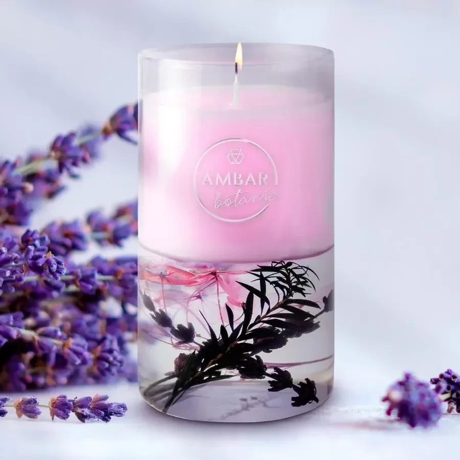 Deze kaars combineert de zachtheid van was en de transparantie van gelatine, waardoor echte natuurlijke kruiden die in de structuur gevangen zitten, naar voren komen. De lavendelgeur verspreidt een ontspannende en rustgevende sfeer. Ideaal voor warme en elegante interieurs.