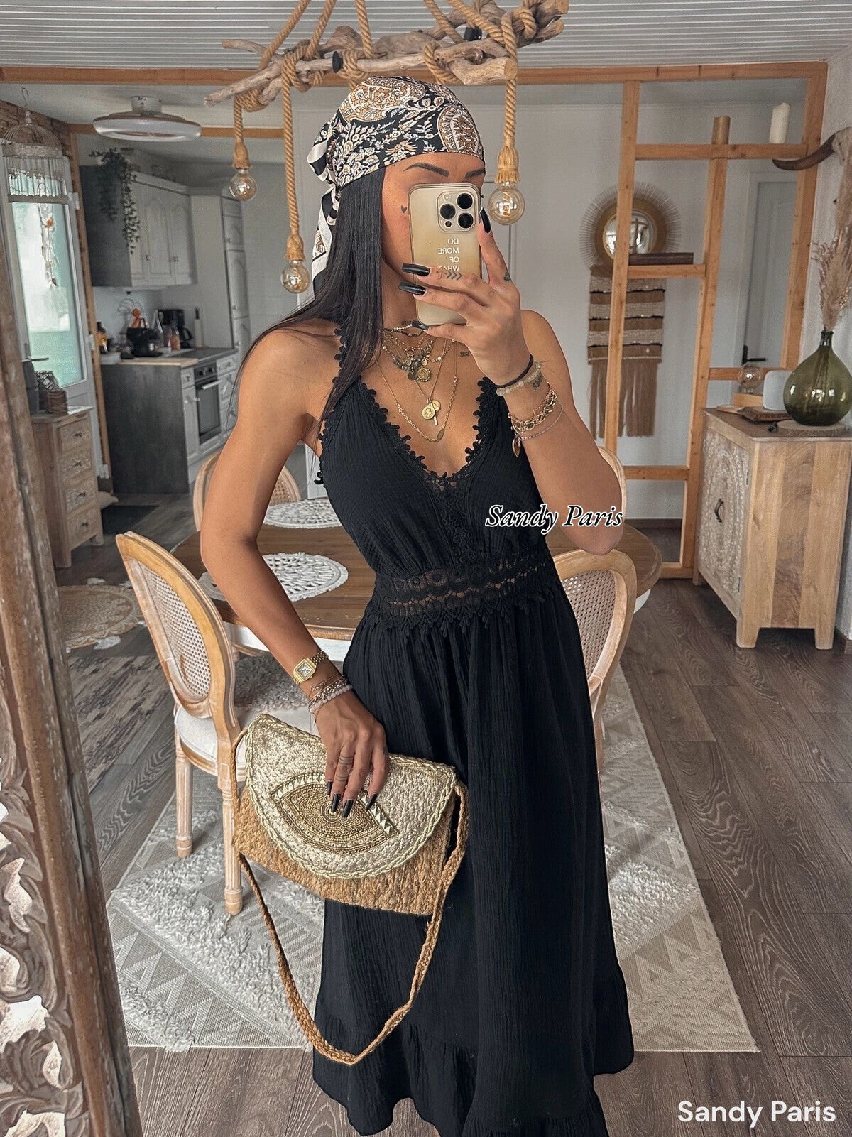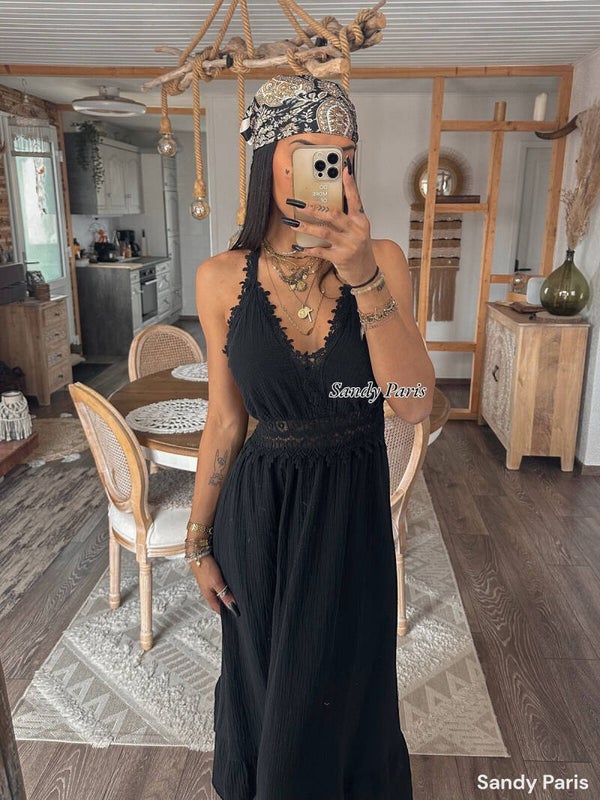 Verrijk uw collectie met deze lange, rugloze jurk van katoengaas, perfect voor een chique en bohemian zomerlook.