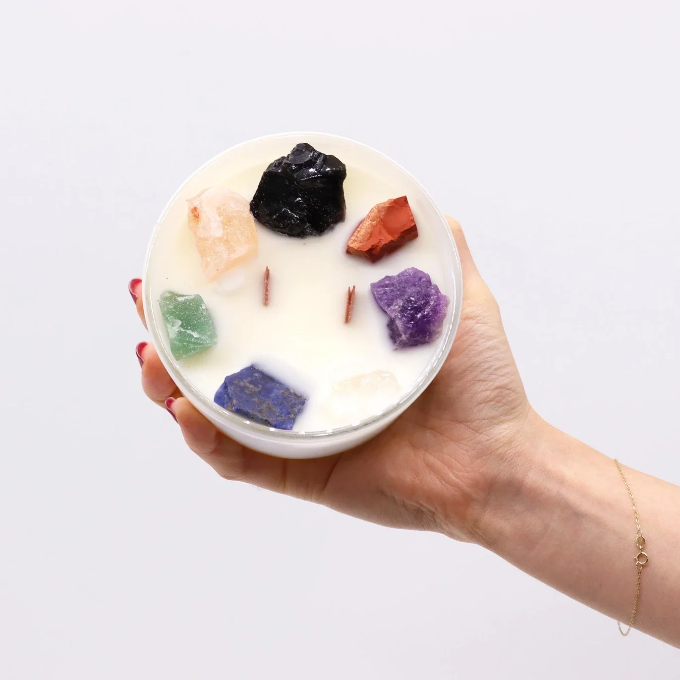 Elke kaars bevat een set van zeven ruwe edelstenen, zorgvuldig geselecteerd om de energiestroom van je chakra's te balanceren: