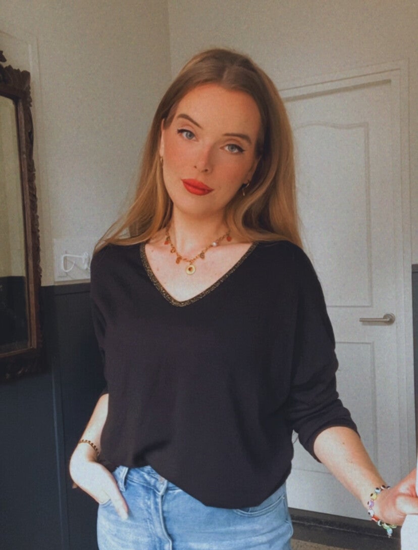 Trendy en comfortabele longsleeve met een gevoerde teddy binnenkant en een subtiel lurex randje langs de hals. Het model is zeer zacht en warm, ideaal voor dagelijks gebruik.