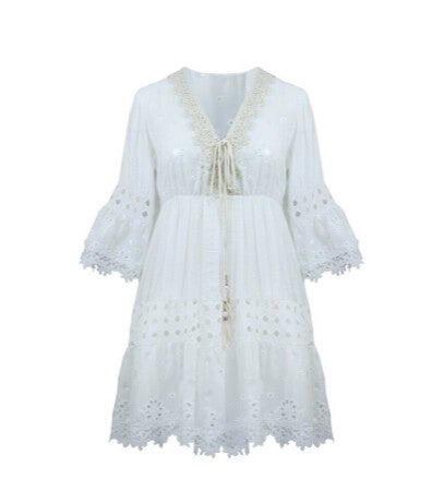 Witte, zomerse jurk bewerkt met kant en broderie. De jurk heeft driekwart trompetmouwen en een V-hals. De jurk heeft een strokenrok die deels bestaat uit opengewerkt broderie.