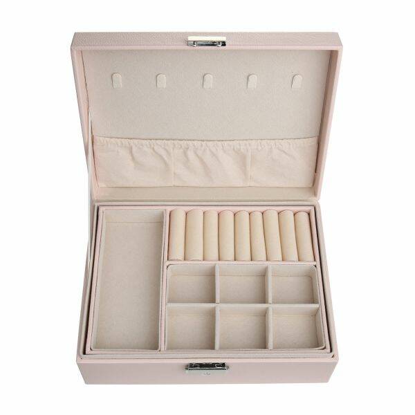 Mooie twee-laagse sieradendoos met voldoende opbergruimte voor al je ringen, kettingen, oorbellen en meer.