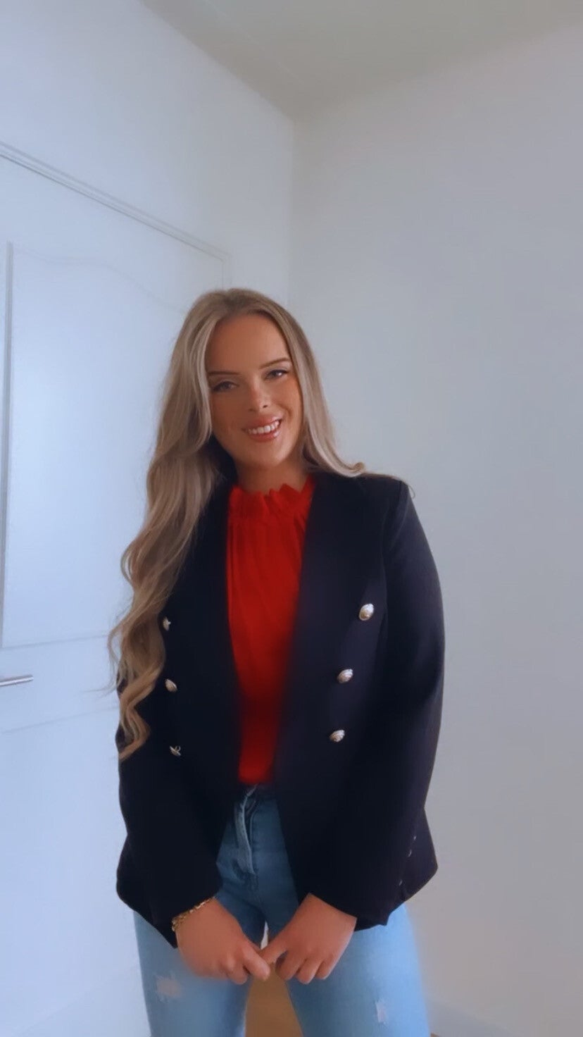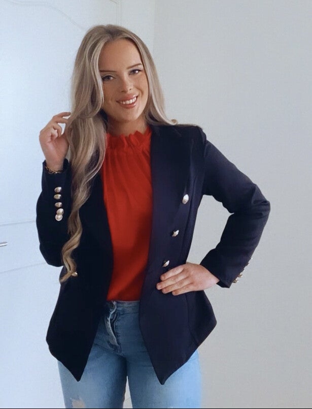 Stijlvolle double breasted blazer met goudkleurige knopen. Deze blazer is geheel gevoerd en heeft schoudervulling.