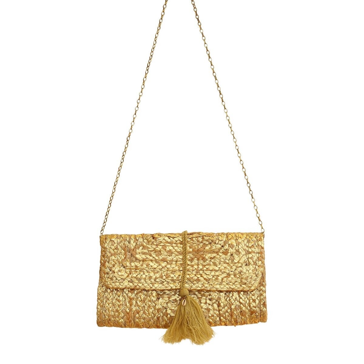 De zomerse clutch met gouden details is met de hand gemaakt van plantaardige vezels (jute). Het is een hippe zomerse tas die je op veel verschillende manieren kan stijlen. De tas kan je met de hand bij je dragen of je kan het om je schouder heen dragen. De clutch is ideaal om je telefoon, portemonnee, make-up tas, waterfles en snacks in te bewaren.