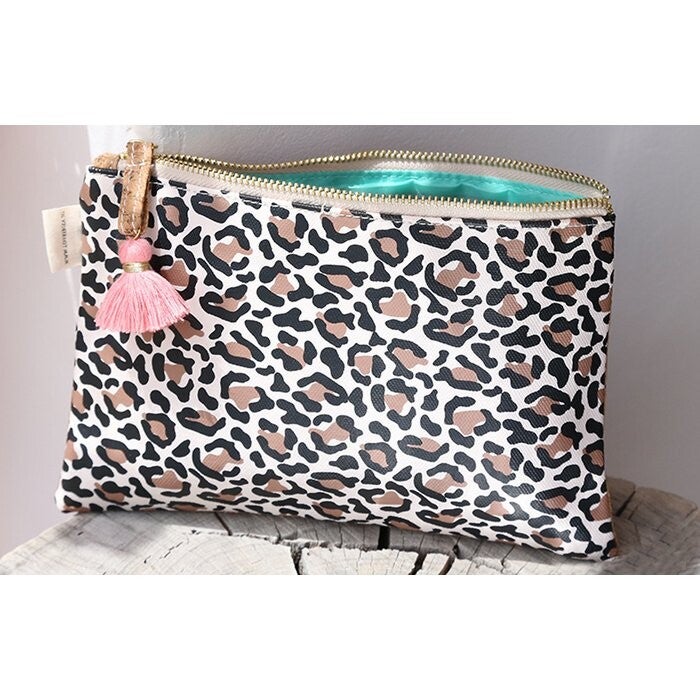 Dit tasje met een voorkant van kurk en een achterkant met leopard print gebruik je voor je make-up spulletjes, op het strand of om je Ibiza elastiekjes in te bewaren.