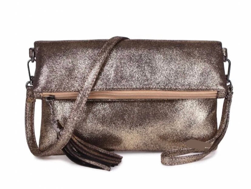 Superzacht fijn kunstlederen schoudertasje/clutch. Het tasje sluit met een rits, en de omslag nog met een dubbele magneetsluiting. Op de achterzijde en onder de klep zit nog een extra vakje met rits. Met afneembaar pols- en schouderbandje.